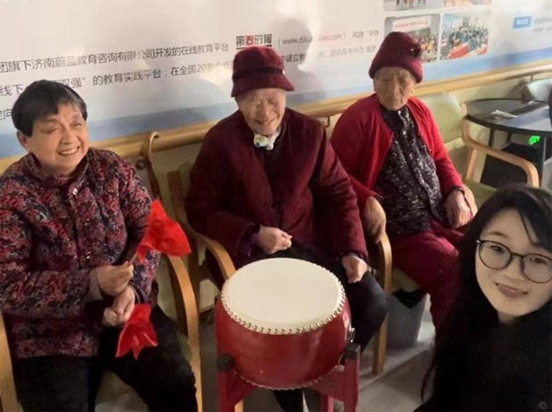 實踐團成員陪老人練習打鼓