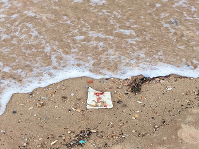 調研伊始,團隊成員來到了廣東省珠海市唐家灣海水浴場,對當地沙灘的污染情況展開了實地調研。在團隊成員的走訪之下了解到,唐家灣海水浴場沙灘的垃圾種類相對較少,以顆粒小、質量較輕的塑料碎屑、木頭碎片等為主,包括短塑料繩、塑料包裝碎屑、煙頭、爛木頭、食品塑料包裝、瓶蓋、燃放完的煙花垃圾等。對于這些塑料,工作人員介紹道:“這里的塑料垃圾有很多時候是海浪帶上沙灘的。”珠海島嶼眾多,碼頭也多,不少漁民將廢棄的塑料薄膜和塑料捆扎繩直接丟棄在海上,海水運動再將這些垃圾帶上海岸。當然也不乏有游客亂丟垃圾。但是在當地紅衣志愿者的清理下,沙灘垃圾總量并不多,環境治理情況相當不錯。