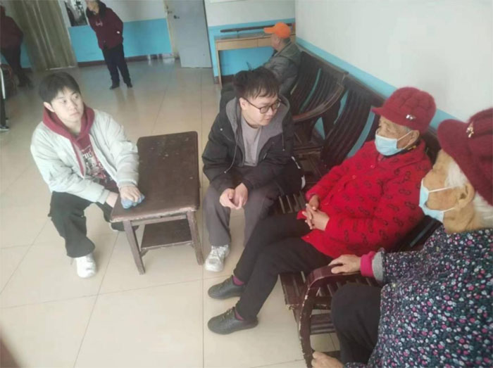 團(tuán)隊(duì)成員推腿腳不方便的老人出去曬太陽