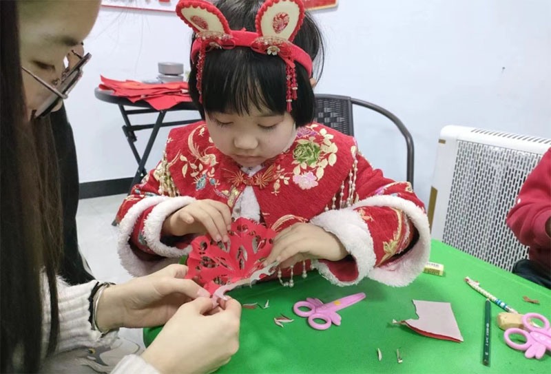 注:志愿者和孩子們進行剪窗花課堂活動
