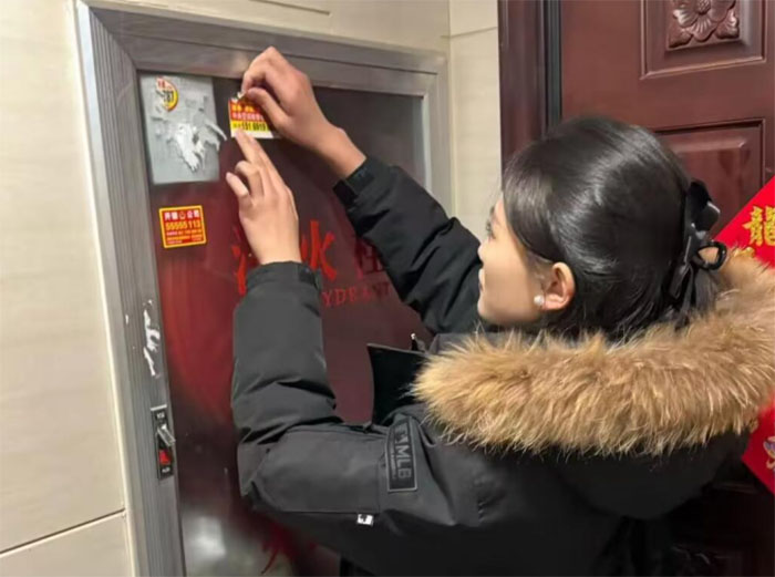 實(shí)踐團(tuán)成員清理消防箱上的小廣告