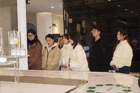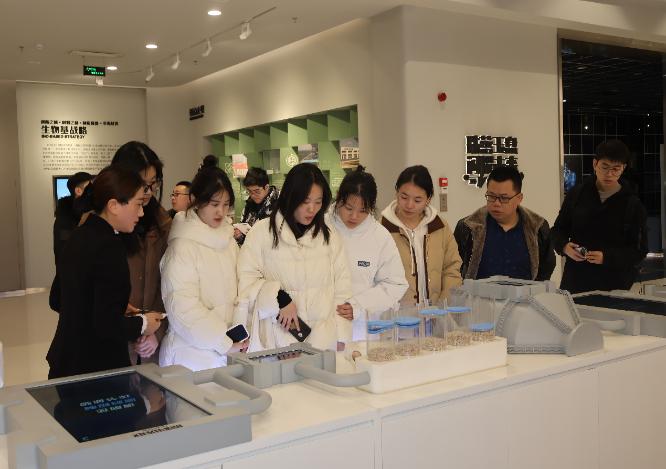 首先,宮科長向實踐團成員介紹了該自貿區的基本情況,并在工作人員的帶領下,通過圖片、視頻、文字及講解等方式生動展示了蚌埠近現代工業的發展軌跡。此外,同學們還重點了解了蚌埠自貿區的硅基戰略和生物基戰略,切身感受到近年來蚌埠立足自身優勢,堅持創新引領,著力打造“雙千億”級蚌埠新材料產業的決心。