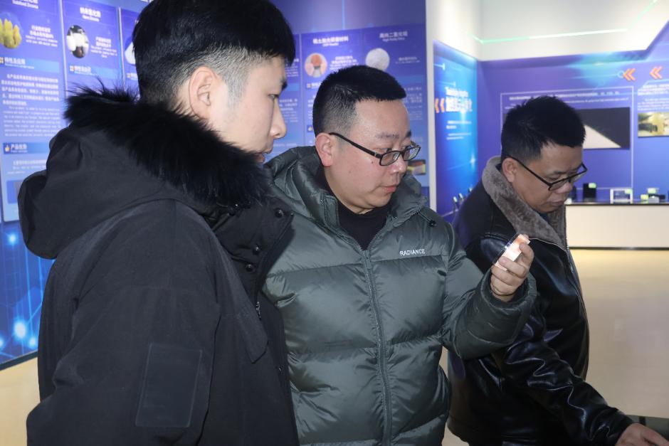 工作人員又向團隊展示了企業的特色產品碲化鎘發電玻璃,“這塊發電玻璃采用的是光源發電技術,由兩塊玻璃基板和一層碲化鎘薄膜構成,曾應用于國家速滑館和張家口冬奧會場館BIPV建筑一體化項目。包括我們國顯科技大樓外層的黑色幕墻也是這款玻璃”。隨后,工作人員還向團隊介紹了企業在車載領域的3D熱彎技術和空氣成像技術。團隊深耕教學一線的李光勤老師和高新老師指出,空氣成像技術不但已經進軍車載領域,在高校的教學方面也將大方溢彩,教師可以將三維模型或圖像直接投影到教室中,讓學生可以立體、真實地觀察和學習,甚至進行虛擬實驗。