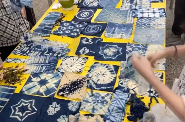 臨近活動的尾聲,同學們紛紛將自己的扎染作品展示出來,與其他人分享創作的喜悅和心得。“一開始并不知道扎染是什么,體驗了一節課之后非常喜歡,當所有人染的布料共同懸掛起來晾曬的那一瞬間,強烈的自豪感充斥心中”,尹晨曦同學這樣說。