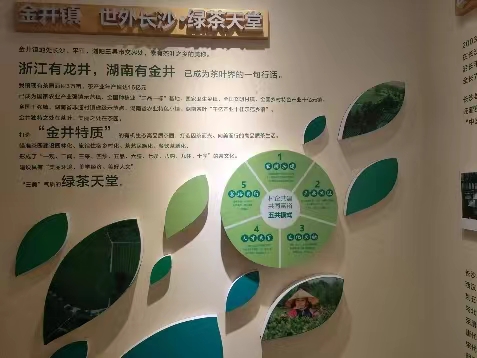 金井鎮作為世外長沙綠茶天堂,其綠茶制作技藝被列入“湖南省非物質文化遺產名錄”。在與展覽負責人溝通交流中,團隊隊員得知,金井茶業培養了20多名非遺傳承人,通過對產業模式的不斷改良,茶葉成為金井鎮的支柱產業。隊員肅然起敬。
