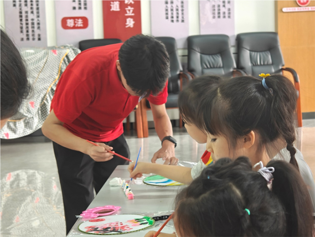 為了讓孩子們充分發揮自己的藝術創造力也為了加深孩子們對“綠水青山就是金山銀山”的認知,黨群服務中心和齊光醫朝馳團隊還組織了一場團扇繪畫活動。在活動中,志愿者們為孩子們準備了各種繪畫材料和工具,并耐心地指導他們如何在團扇上繪制出精美的圖案。