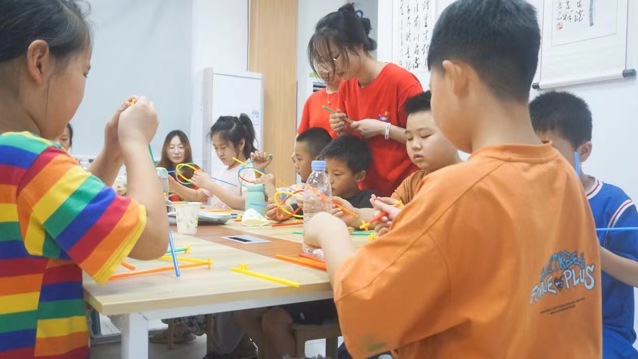 活動過程中志愿者們穿插了一場別來生面的“4D拼搭積木游戲”。志愿者們先通過一個簡短而生動的介紹,向孩子們展示了4D拼搭積木的奧秘,隨后,分發了色彩斑斕、形狀各異的4D積木包給每位孩子,并耐心地指導孩子們理解每個零件的作用。隨著孩子們的雙手忙碌起來,活動室漸漸變成了一個充滿創意的工作坊。有的孩子專注地搭建著自己的作品,偶爾抬頭與旁邊的小伙伴交流心得;有的孩子則展開了友好的競賽,看誰能又快又好地完成挑戰。志愿者們穿梭其間,時而解答疑問,時而提出建議,確保每個孩子都能在遇到困難時得到及時的幫助。