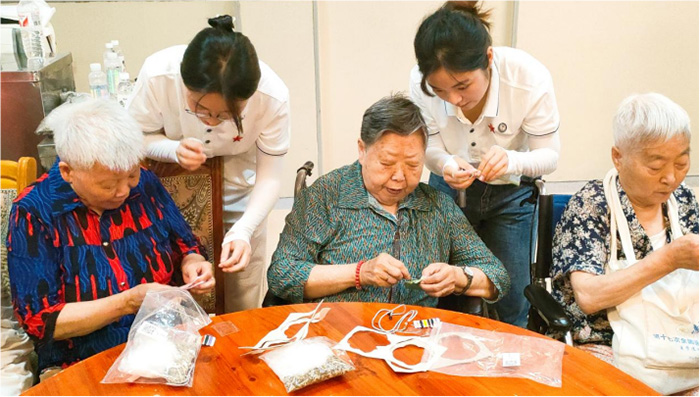 互動環節中,川北醫學院與江蘇師范大學科文學院的志愿者們共同陪老人制作手工藝品,當一個個美麗的艾草包制作完成后,老人們臉上都洋溢著幸福的笑容,其中一位奶奶非常開心地把艾草包掛在脖子上并說:“這是我時隔幾十年再做手工針線活兒,雖然眼睛看不太清楚啦,但是手藝還是在呢”。活動現場充滿了歡聲笑語,此次“一東一西”兩校聯動志愿活動,不僅增進了兩校之間的友誼,更讓敬老院的老人們感受到了社會的溫暖和關懷。它如同一場友誼的接力賽,將兩代人的心緊緊相連,共同譜寫了一曲敬老愛老的時代贊歌。