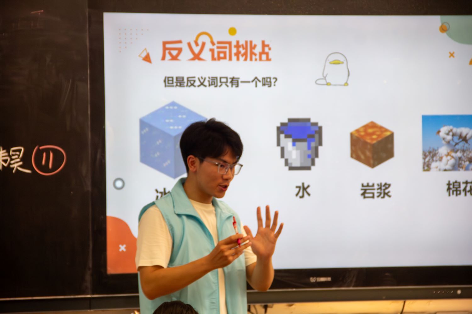 小組長選舉塵埃落定后,班會迎來了最后一個環節——反義詞挑戰賽。本環節旨在通過游戲形式進一步激發小朋友們在趣味游樂中培養質疑精神與發散思維。從“太陽”的熾熱到“螞蟻”的渺小,每個詞匯都激發了孩子們的思考與回答。他們或以對偶之巧思,如“太陽對月亮,明暗交替”;或以排比之氣勢,列舉多種反義詞,展現語言的豐富與靈活。