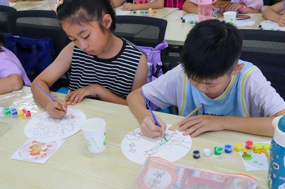 在實踐團成員的悉心指導下,孩子們開始了自己的創作。有的孩子在扇面上勾勒出荷花的輪廓,寓意著高潔與堅韌;有的則大膽揮墨,將抽象的圖案與繽紛的色彩交織在一起,展現出無限的創意。整個過程中,孩子們與實踐團成員之間的互動熱烈而積極,空氣中彌漫著藝術的氣息和快樂的笑聲。