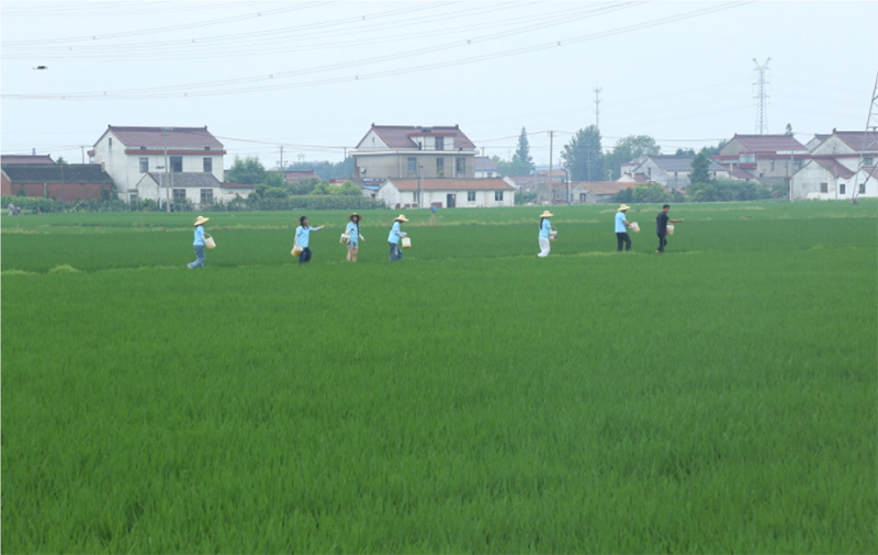 隊員們在仲曉磊的指導下下田施肥,體驗傳統農耕的辛勞。大家拎著裝滿化肥的桶沿著田埂向邊緣灑肥,從一開始的手忙腳亂、撒多撒少,到熟練后每一次揮手劃出一道弧線,肥料均勻的落在水稻之間,隊員們體會到用科技提高農業生產效率和精度的重要意義。