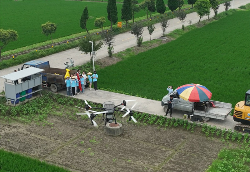 第二站:蔣莊村 第二站團隊前往了蔣莊村90后“新農人”代表仲曉磊的可新家庭農場,仲曉磊和他的團隊給隊員們展示了啟用無人機空中噴灑農藥的全過程,介紹了無人機噴灑農藥的工作模式,強調不僅省時省力,有效降低農藥使用量,還能減少誤差,實現精準作業。