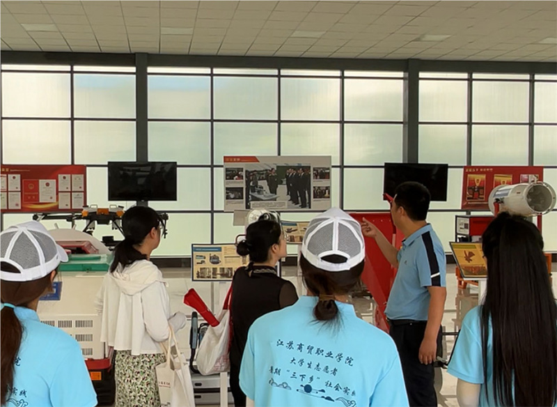 在廣益農機館,陳列著的各種各樣的農業機械設施,張宇森向隊員們介紹了廣益農機有限公司和楊莊村聚力合作研發推廣無人機、割草機等農機設備的基本模式,描述了科技興農助農的工作思路。