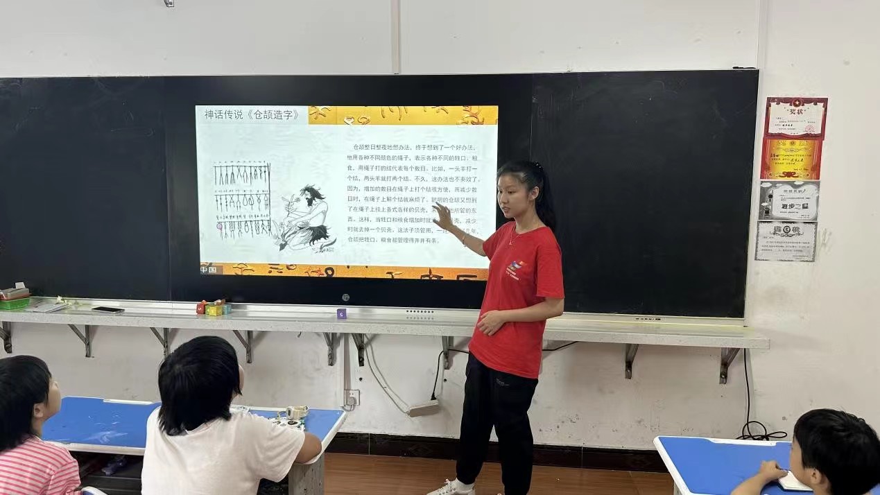 圖為志愿者在講解漢字的起源 在寬敞明亮的活動室里,鋪滿了宣紙,空氣中彌漫著淡淡的墨香。孩子們全神貫注地聆聽,小心翼翼地嘗試,志愿者們耐心地指導,鼓勵孩子們自由發揮。隨著活動的深入,一幅幅作品逐漸呈現,有的工整嚴謹,有的天真爛漫,每一張紙上都承載著孩子們的用心和志愿者的溫情。