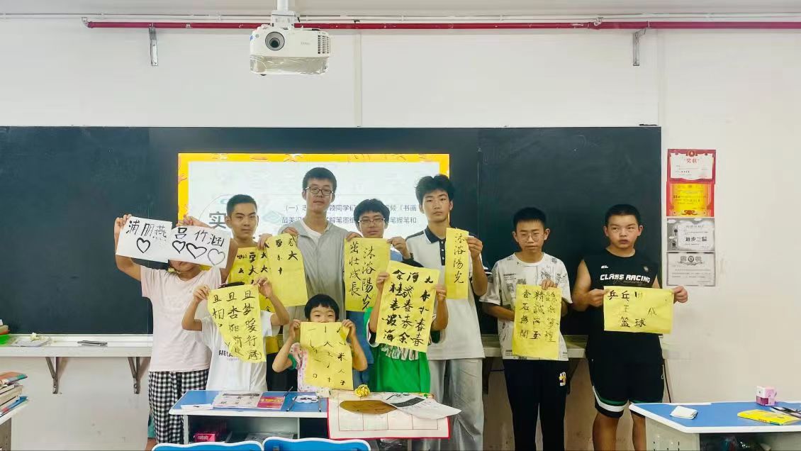 圖為小朋友們展示自己的毛筆作品 在此次志愿者服務活動中,實踐團成員將防溺水教育與毛筆字藝術創作相結合,不僅能讓孩子們獲得實用的安全技能,還能在藝術的熏陶中提升個人修養,實現身心的全面發展。