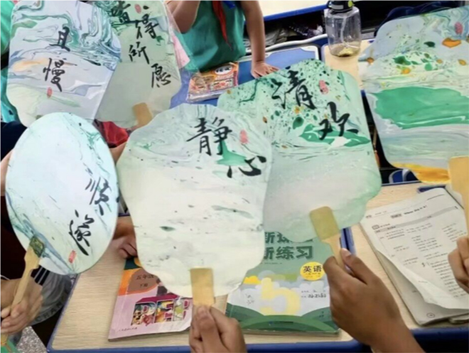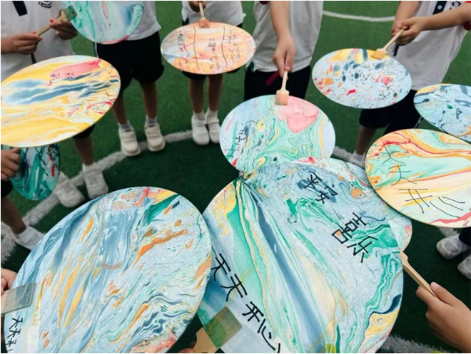 隨著影片的緩緩導入,孩子們對漆扇制作的過程愈發(fā)期待。在實踐隊隊員的指導下,學生們排隊領取了素扇和漆料,踏上了探索漆藝奧秘的旅程。他們或認真調色,或撥起水紋,一舉一動都凝聚著對美的追求與對傳統(tǒng)文化的敬畏。一把把素扇或旋轉,或擺動著浸入水中,五彩斑斕的漆料在扇面上緩緩流淌。一幅幅獨一無二的漆扇作品逐漸成型,不僅展現(xiàn)了孩子們的創(chuàng)造力與想象力,更成為了他們與傳統(tǒng)文化之間情感交流的橋梁。