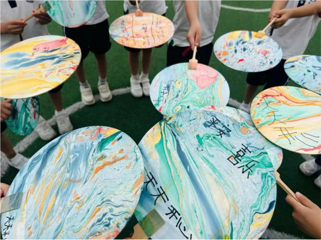 為更好地讓學生了解及體驗漆扇的制作過程,曲阜師范大學“丹漆隨夢·樂道拾遺”實踐隊隊員購買了制作所需的各種材料,準備了相應的PPT,進入多所校園和多個社區開展漆扇體驗活動,同學們首先學習了漆扇的基本制作流程,包括選材、切割、成型、上漆等步驟。隨后,他們充分發揮自己的想象力和創造力,在扇面上自由繪制出各種圖案。有的同學選擇了山水畫,用細膩的筆觸勾勒出山川的壯麗與秀美;有的同學則嘗試了現代簡約風格,用簡潔的線條和色彩表達出獨特的審美意趣,最后學生們將扇子放入水中,在實踐隊員們的輔導下,以點、甩、彈、劃等手法,在水面繪出圖案效果,再暈染在扇面,隨著活動的深入,一把把精美的漆扇逐漸呈現在大家眼前,制作出的漆扇成品各不相同。學生們在保持傳統工藝的基礎上,融入了自己的創意與情感,使每一把漆扇都獨一無二。