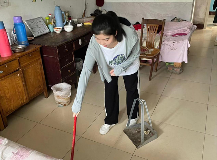 實踐團成員在與老人們交流完之后,便開始打掃老人的房間。實踐團成員們手持清潔工具,認真地開展衛生清理工作,對老人的房間進行全面打掃,掃地、拖地、清理衛生死角,確保老人的居住環境整潔有序。