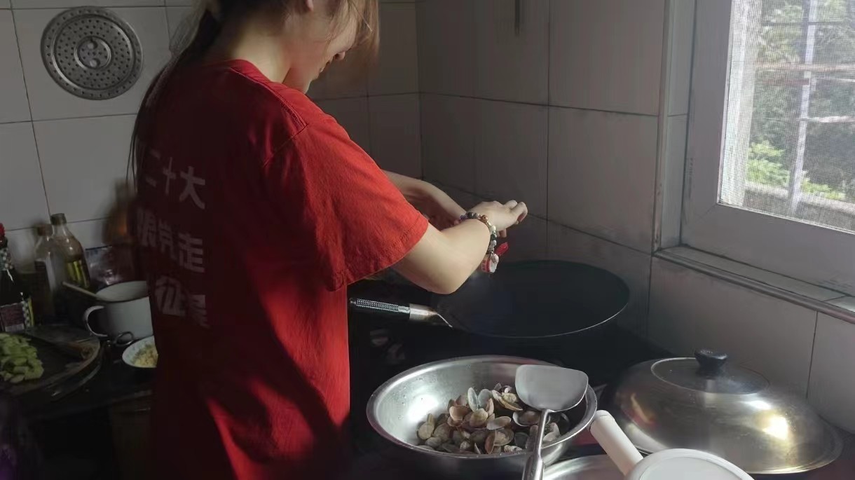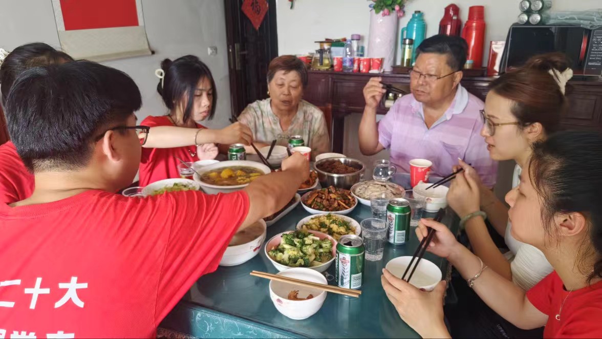 隨后,大家分工合作,有的洗菜切菜,有的掌勺烹飪,最終共同完成了一頓美味可口的午餐。餐桌上,志愿者們與焦爺爺親切交談,