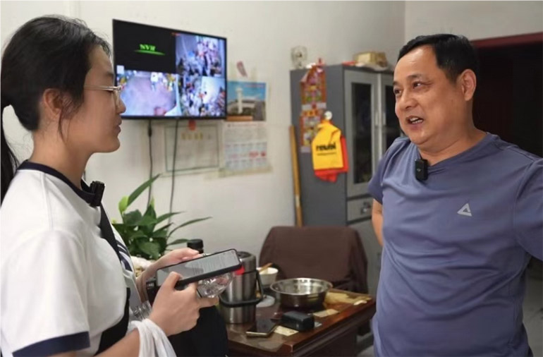圖為團隊成員采訪負責人鄭士付 楊羽凡 攝