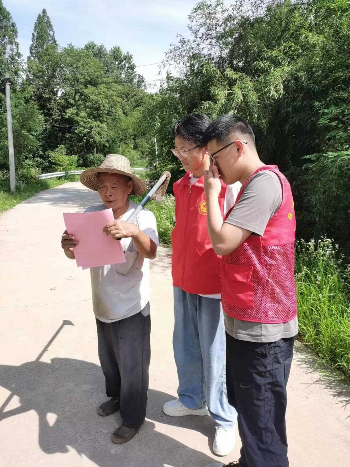 圖為實踐隊員向居民發放防溺水宣傳單并講解 。任杰 供圖