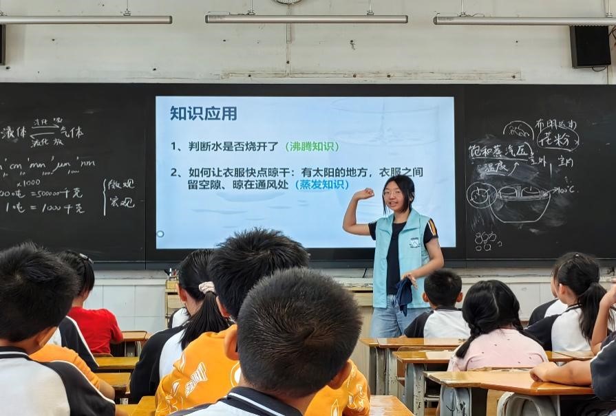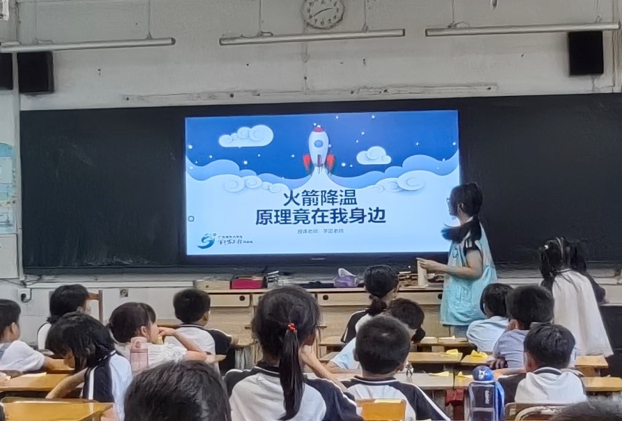 2024年7月30日,在華南師范大學(xué)物理學(xué)院團(tuán)委學(xué)生會(huì)服務(wù)隊(duì)在百千萬行動(dòng)期間開展了一堂名為“火箭降溫,原理竟在我身邊”的特色課程。此次課程旨在通過科技教育資源的下沉,激發(fā)小朋友們對科學(xué)的興趣,培養(yǎng)他們的創(chuàng)新思維和實(shí)踐能力,為鄉(xiāng)村振興播下科技的種子。芋泥老師通過帶領(lǐng)星槎小學(xué)暑假成長營的小朋友們做簡易實(shí)驗(yàn),了解火箭降溫過程中涉及的汽化和液化原理,幫助小朋友們理解生活中的汽化和液化現(xiàn)象,并把物態(tài)變化的知識應(yīng)用在日常生活中。