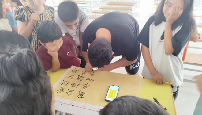 課程結束后,人文學院服裝與服飾設計2023級2班金永輝同學向當地學生展示瘦金體,深受當地學生的喜歡,同學們爭先恐后地讓金永輝同學為他們書寫自己的名字。同學們也主動拿起毛筆進行練習、創作。“