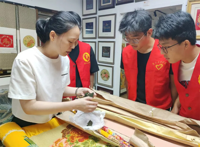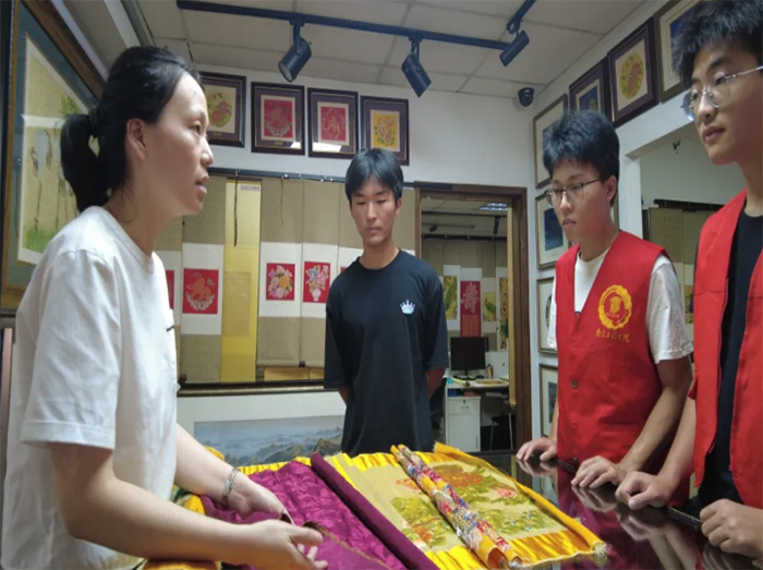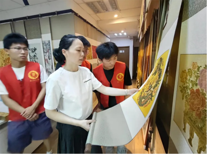 南京云錦宜貢坊作為云錦生產(chǎn)廠家之一,將傳統(tǒng)文化與現(xiàn)代科技相融合,讓云錦煥發(fā)出無(wú)窮的魅力。一踏入云錦宜貢坊,成員們便被眼前華美壯觀的云錦制品所吸引。從精美的龍袍、鳳袍到各式各樣的云錦圍巾、手袋,傳統(tǒng)美感和現(xiàn)代產(chǎn)品的實(shí)用性相融合,既保留了云錦的傳統(tǒng)魅力,又賦予了它現(xiàn)代的活力。在講解員的帶領(lǐng)下,成員們?cè)敿?xì)了解了現(xiàn)代云錦產(chǎn)品的制作過(guò)程,包括絞絲、筒子絡(luò)絲、單絲打捻、并絲、復(fù)捻等復(fù)雜工序,以及最為關(guān)鍵的“挑花結(jié)本”技藝。通過(guò)參觀學(xué)習(xí),團(tuán)隊(duì)成員深入了解傳統(tǒng)文化,感受到非遺文化的無(wú)窮魅力,他們紛紛表示,定要學(xué)好科技文化知識(shí),用科技賦能文化傳承,以行動(dòng)弘揚(yáng)中華優(yōu)秀傳統(tǒng)文化。