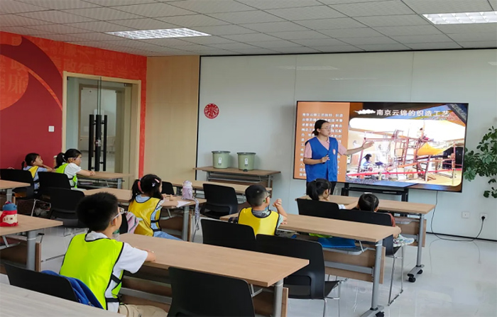 江寧織造博物館以清代江寧織造沿革為主線詳細(xì)展示了江寧織造署的興衰脈絡(luò),從清代歷任江寧織造簡(jiǎn)表到“勤政堂”復(fù)原陳列,再到江寧行宮圖、相關(guān)建筑模型……通過(guò)參觀學(xué)習(xí),團(tuán)隊(duì)成員們深入了解江寧織造府長(zhǎng)達(dá)260多年的興衰歷史,感受到繁華背后深厚的文化內(nèi)涵與歷史底蘊(yùn)。漫步“云錦天衣”展館,穿梭于件件蹁躚的錦繡華服之中,透過(guò)華美繁復(fù)的花紋,仿佛能窺見(jiàn)歷史的厚重與浪漫。伴隨著志愿者的講解,成員們不禁被云錦工藝的精細(xì)復(fù)雜所震撼,更被云錦背后精益求精、一絲不茍的匠人精神所打動(dòng)。