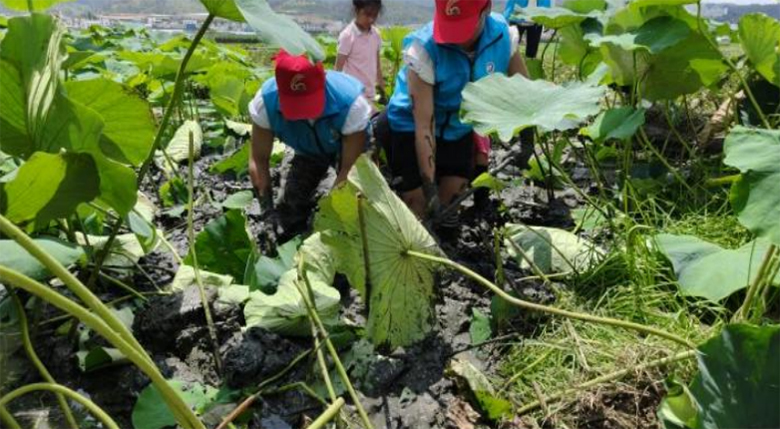 實踐出真知,汗水換成果 抵達藕田后,團隊成員被那片綠意盎然的景象所吸引。在當地藕民的指導下,他們穿上了防水服,拿起鐵鍬,開始了挖藕的實踐活動。團隊成員受到了竹園鎮政府干部的熱情接待。在座談會上,他們詳細介紹了竹園鎮的發展規劃,并談到了政府在農業技術培訓、市場拓展和基礎設施建設方面的投入和支持。這些信息讓團隊成員對竹園鎮的未來發展充滿期待。