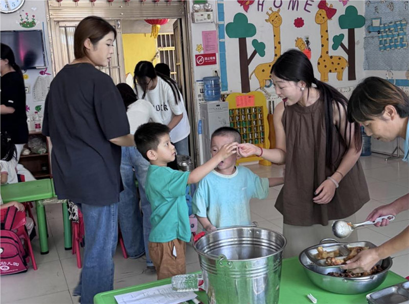 圖為實踐團成員為幼兒園兒童分發食物