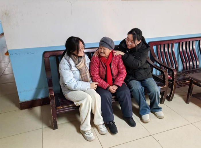 圖為實踐團成員田瑞霞、王君茹陪老人聊天談心