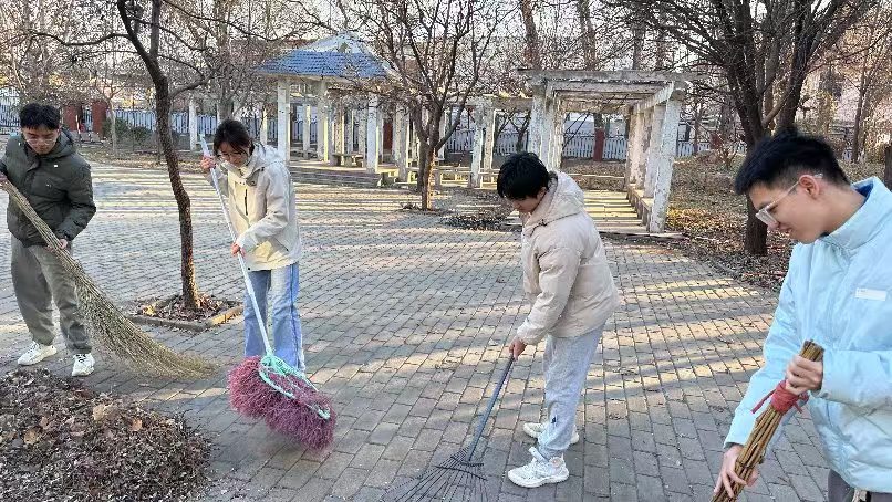 注:圖為實踐團成員范曉宇、張夢榮、劉毅、魏俊杰打掃枯葉