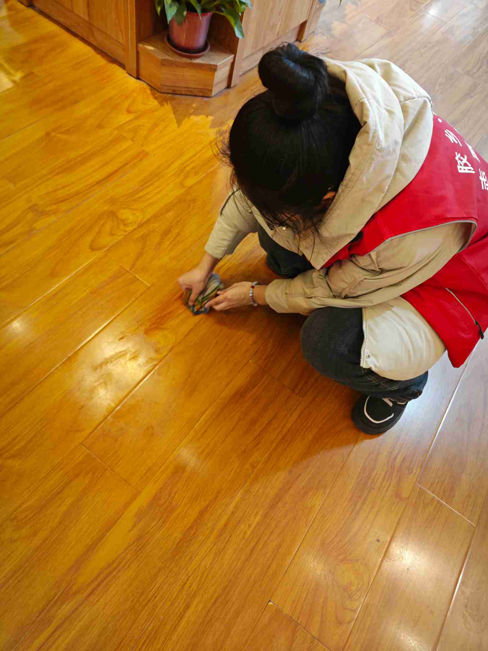 圖為實踐隊員擦拭木板地。 崔新瑤 供圖