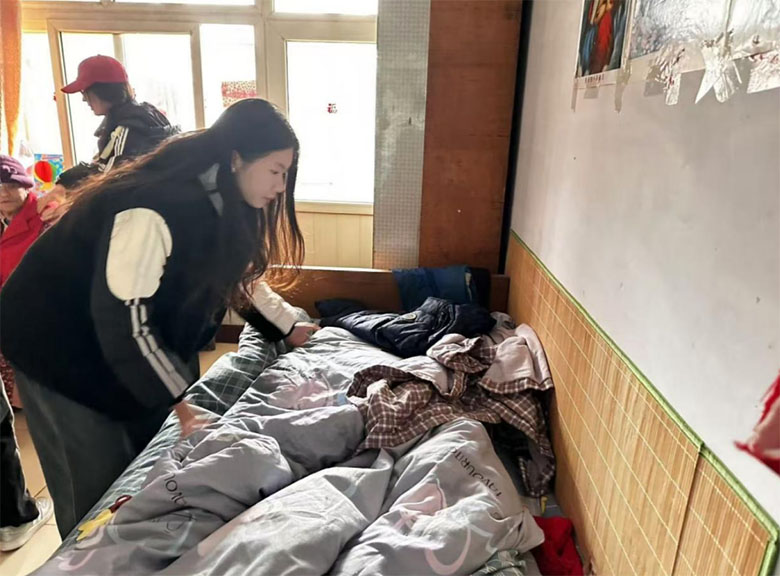 除了陪伴和表演節目,成員們主動承擔起養老院的一些清潔工作,幫助老人疊被子,整理物品等,讓老人們的生活環境更加整潔舒適。