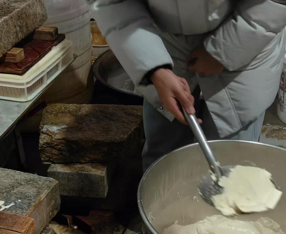 泰山地區(qū)的水質(zhì)清冽甘甜,富含多種礦物質(zhì),為豆腐的制作提供了得天獨(dú)厚的條件。用此水點(diǎn)制的豆腐,口感細(xì)膩爽滑,豆香濃郁醇厚,且營(yíng)養(yǎng)豐富,含有大量的蛋白質(zhì)、鈣、鐵等人體所需的營(yíng)養(yǎng)成分,具有益氣和中、生津潤(rùn)燥、清熱解毒等功效,深受當(dāng)?shù)匕傩蘸陀慰偷南矏邸L┥焦欧ǘ垢粌H是一種美食,更與當(dāng)?shù)氐拿袼孜幕o密相連。在泰山周邊的一些傳統(tǒng)節(jié)日和慶典活動(dòng)中,豆腐常常是不可或缺的食材,被制作成各種美味的菜肴和小吃,如豆腐宴、煎豆腐、豆腐腦等,寓意著生活富足、幸福美滿。同時(shí),泰山古法豆腐的制作技藝也在民間代代相傳,成為了當(dāng)?shù)匕傩站S系情感、傳承文化的重要紐帶。為了深入了解和傳承泰山古法豆腐這一中華優(yōu)秀傳統(tǒng)文化,2025年1月16日,“云舒華章實(shí)踐隊(duì)”踏上了前往泰山的社會(huì)實(shí)踐之旅。此次實(shí)踐活動(dòng)積極響應(yīng)國(guó)家關(guān)于加強(qiáng)中華優(yōu)秀傳統(tǒng)文化傳承發(fā)展的政策號(hào)召,旨在通過實(shí)地調(diào)研和體驗(yàn),挖掘和弘揚(yáng)地方特色飲食文化。