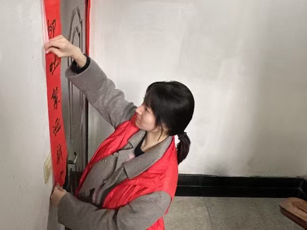 蛇年將至,實踐團成員加入貼春聯活動。 活動現場,志愿者分工明確,搬運春聯、涂抹膠水、張貼,有條不紊。期間,實踐團成員與居民熱情互動,小朋友也踴躍加入。