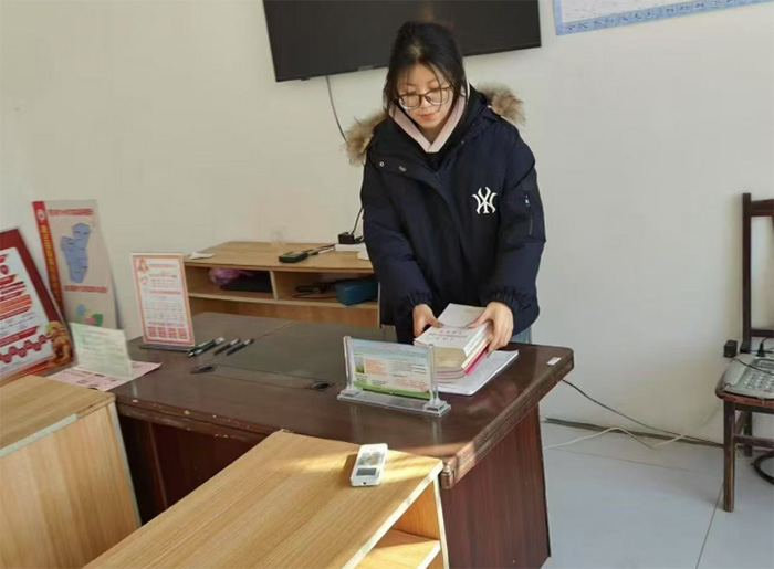第一天實踐團成員為村民整理書籍,書柜里有各種類別的書籍,包括政經、科技、生活、文化、少兒等,這些書讓居民的閱讀熱情越來越多,還成為了他們獲取知識和技能的重要場所,為鄉村振興注入了強大的文化力量。