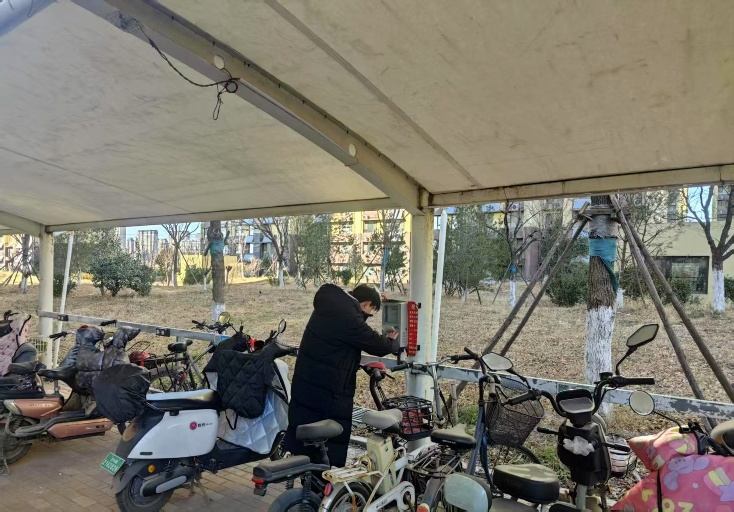 圖為“即刻行動”實踐團(tuán)成員在排查充電棚隱患