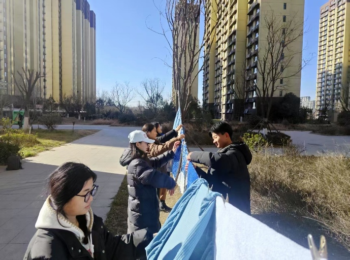 考慮到冬季陽光充足但氣溫較低,成員們還主動幫助行動不便的老人晾曬被褥。在樓下的空地上,幾名實踐團(tuán)成員協(xié)作展開厚重的棉被,一邊抖動拍打,一邊將其整齊晾曬在晾衣條上,力求讓老人們滿意。