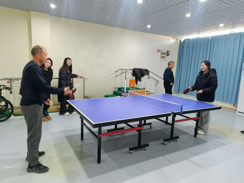 養老院的室內傳來了乒乒乓乓的聲音。實踐團成員與老人進行了一場友誼乒乓球比賽。通過此次乒乓球比賽活動,希望不僅能讓養老院的老年人感受到運動的快樂,還能增強他們的社交互動,提升生活質量。