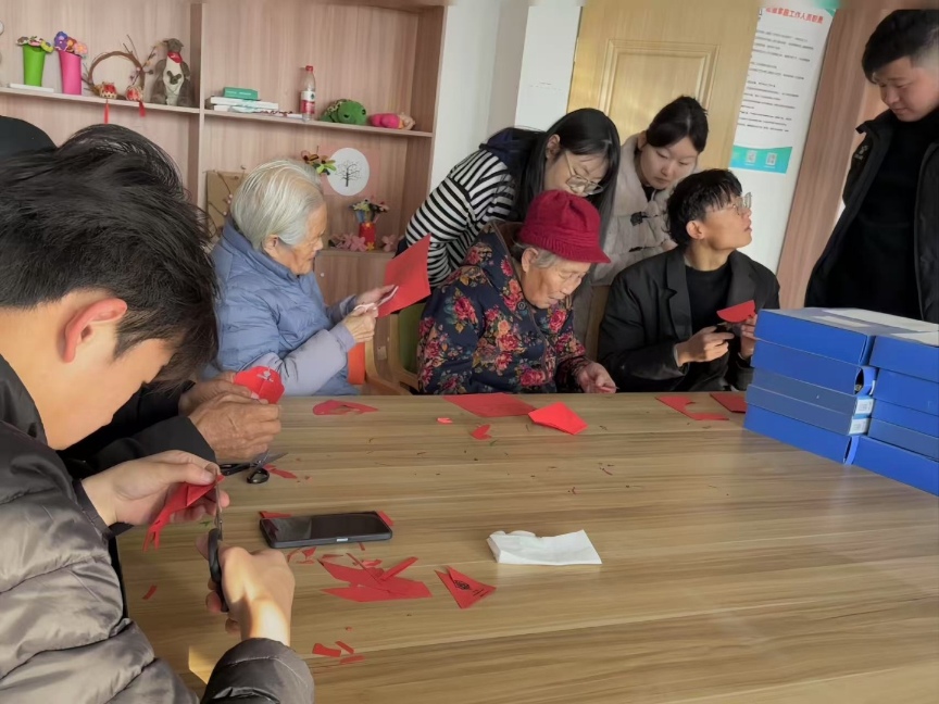在與老人們相處中,實踐團敏銳捕捉到他們對傳統文化的熱愛。于是,精心籌備了一場別開生面的剪紙窗花活動。活動當天,成員們把彩紙、剪刀整齊擺放在桌上,手把手教老人們剪紙。一開始,老人們的手法略顯生疏,紙張在手中微微顫抖,但在成員們耐心細致的指導下,老人們逐漸掌握了剪紙的技巧。老人們看著自己的作品,眼中閃爍著喜悅與自豪。