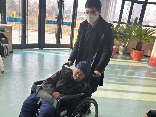 實踐團成員們抵達養老院,了解過養老院內基本情況之后,便迅速展開活動。實踐團成員發現養老院內有許多腿腳不便的老年人,實踐團成員便推著輪椅帶其在院內散步聊天。