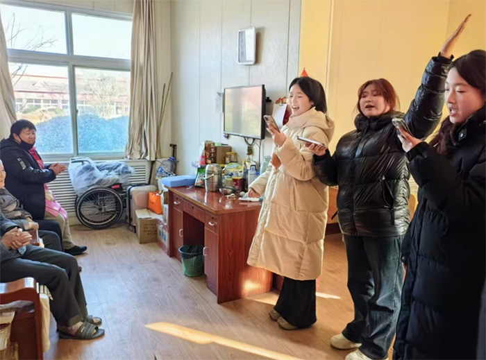 圖為實踐團成員馬雯嫻、韓曉悅、李文琪給老人們唱歌
