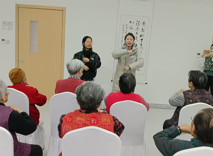 圖為實踐團成員魏芯、李涵煜教老人手勢舞鍛煉老人手臂手腕肌肉
