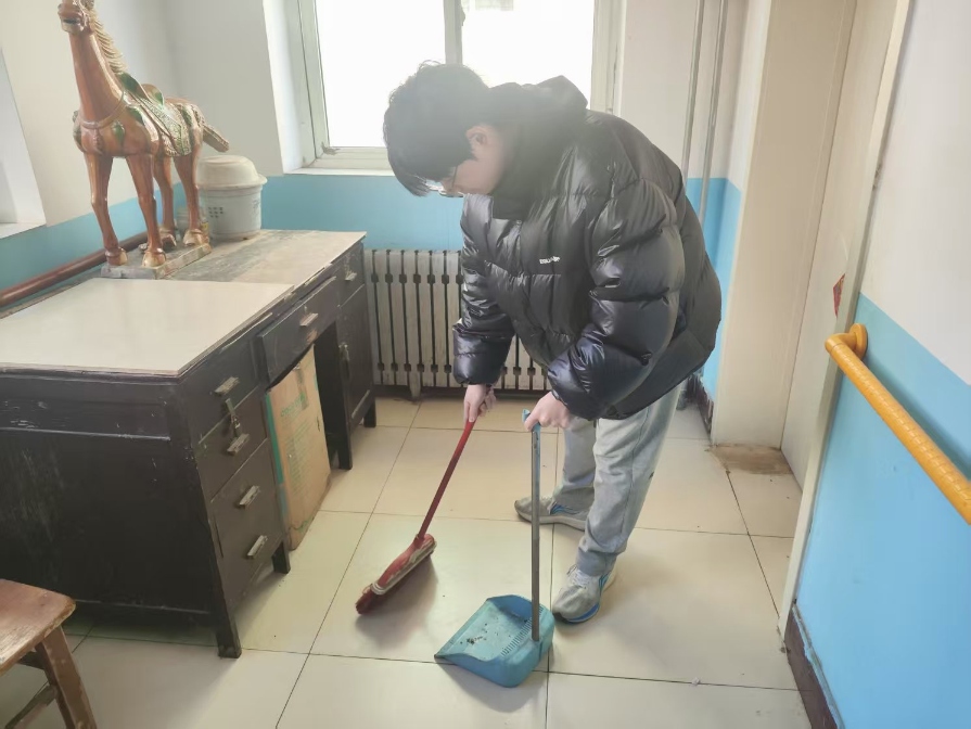 實踐團成員們拿著工作人員分發(fā)的清理衛(wèi)生的工具,大家進行擦拭著里面內(nèi)的桌椅板凳和樓梯衛(wèi)生,同時一些成員給老人整理內(nèi)務·,另一些負責和老人們散步,去鍛煉室鍛煉身體。