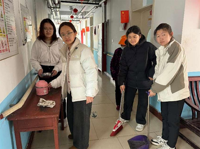 實踐過程中,志愿者們的身影頻現于老年公寓的各個角落。上午時分,一群學生聚集在院外,與一位坐著的老人互動。她身著花色毛衣,神采奕奕地回應著年輕人的提問,旁邊還有人蹲下身傾聽。另一場景中,幾名志愿者站在樓道內,手持拖把和掃帚,認真清掃地面,墻上的紅燈籠與國旗增添了幾分節日氣氛。下午,陽光漸暖,志愿者們繼續忙碌,有人幫老人整理衣物,有人則陪同散步,院落里不時傳來歡聲笑語。