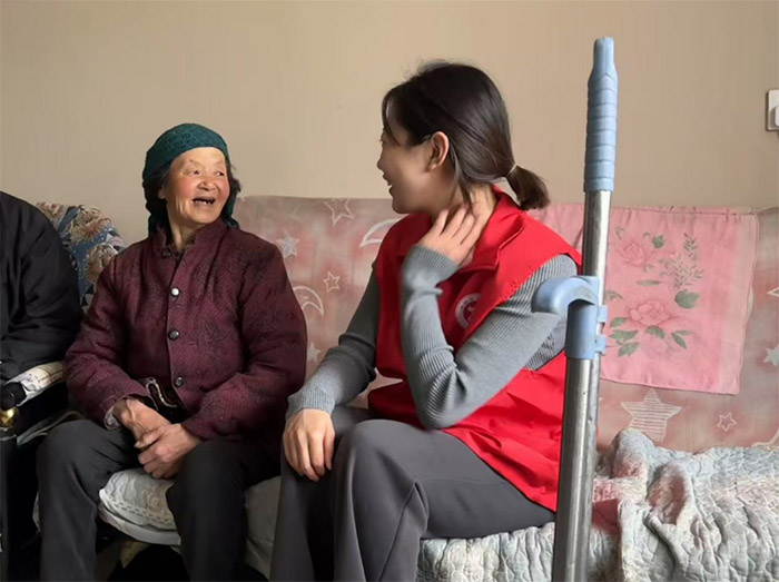 活動首日,實踐團成員早早來到祥和社區,探訪了多位獨居老人。圖中,一位身穿紅色志愿服的年輕女子正與一位年過八旬的老太太親切交談。老人坐在沙發上,臉上洋溢著笑容,雙手緊握著拐杖,似乎在訴說著日常生活的點滴。而志愿者則耐心傾聽,偶爾點頭回應,氣氛溫馨而融洽。據社區居民介紹,這位老人因行動不便,平時較少與外界接觸,志愿者的到來讓她感到格外欣慰。隨后,志愿者們還為老人整理房間,檢查家中安全隱患,確保生活環境更加舒適。