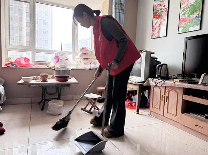 志愿者手持掃帚和簸箕,在居民家中清潔地板,將散落的垃圾清掃干凈。窗外,陽光灑進房間,映照著整潔的地面,增添了幾分生機。此外,實踐團成員還走上社區街道,使用夾鉗清理綠化帶中的廢棄物,保障行人安全。路過的居民紛紛表示,志愿者的努力讓社區環境煥然一新。