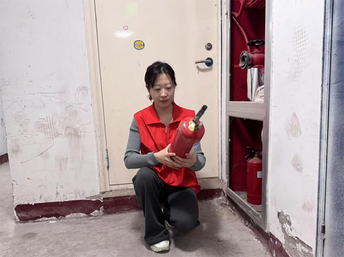 除了探訪老人,志愿者還積極參與社區環境整治工作。圖中另一場景顯示,一名志愿者身著紅色馬甲,跪在地上從消防柜中取出滅火器,仔細檢查其使用狀態,確保設備完好無損。這一系列行動體現了實踐團對社區安全的高度關注。